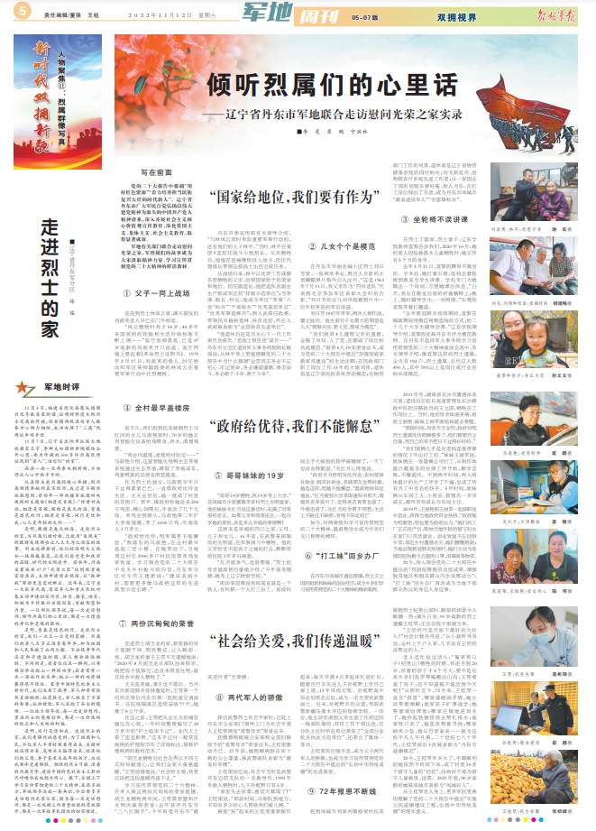 是啊,同行是你和我。走進烈士的家,我們更強烈地感受到,為了祖國和人民,不僅軍人平常時候看得出來、關鍵時刻站得出來、危難關頭豁得出來,就連他們的父母、妻子甚至未成年的孩子,往往也要承受著犧牲。犧牲的烈士可敬,活著的烈屬可學,建設中國特色社會主義新時代呼喚你我他勠力同心。眼下,全國上下學習宣傳貫徹黨的二十大精神,在很多地方,軍地領導達成一條共識,今后要多多走訪慰問光榮之家,因為每一次走訪慰問,都是一次雙擁工作質(zhì)量效能的有效提升,都是一次軍政軍民團結(jié)的切實增進。