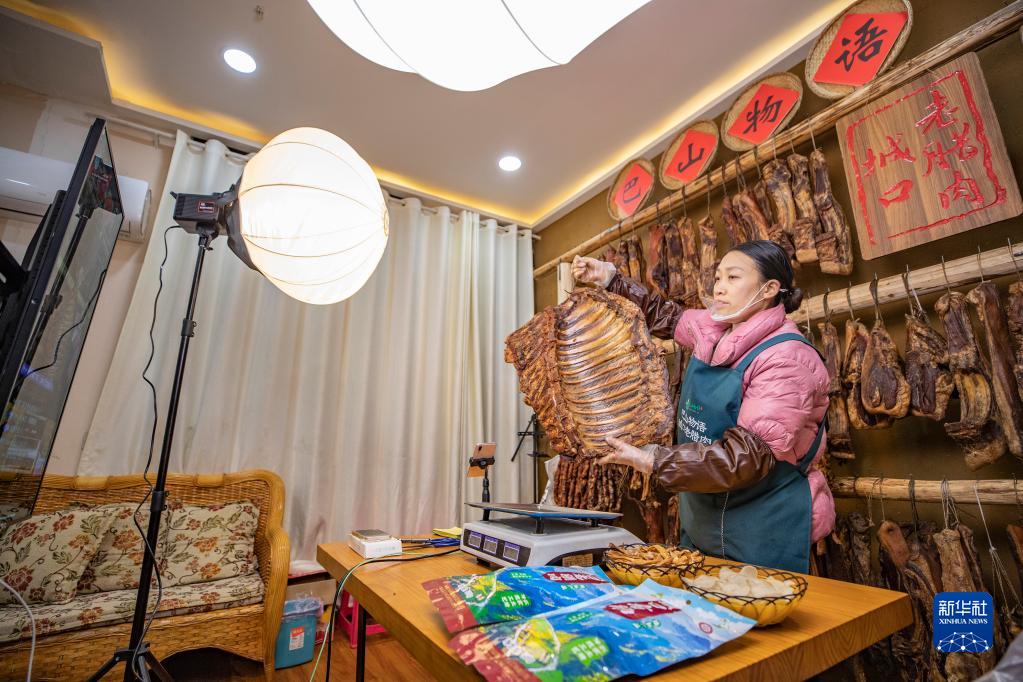 1月4日,在重慶市城口縣巴山物語電商超市,主播向直播間的觀眾介紹城口臘排骨。新華社記者 黃偉 攝