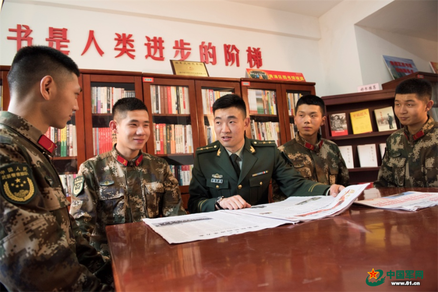 楊澤楠帶領(lǐng)中隊官兵學(xué)習(xí)黨的創(chuàng)新理論。