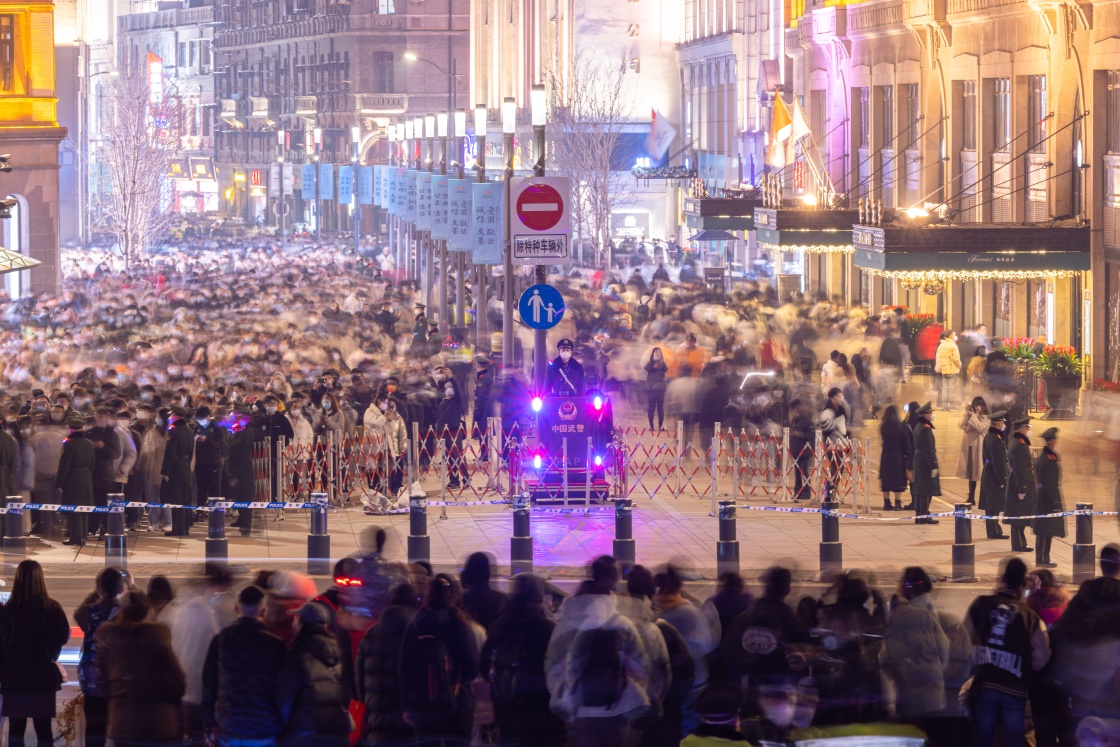 1月1日凌晨,武警上??傟?duì)機(jī)動(dòng)第一支隊(duì)官兵在南京東路路口以“環(huán)島”形式疏導(dǎo)人流。