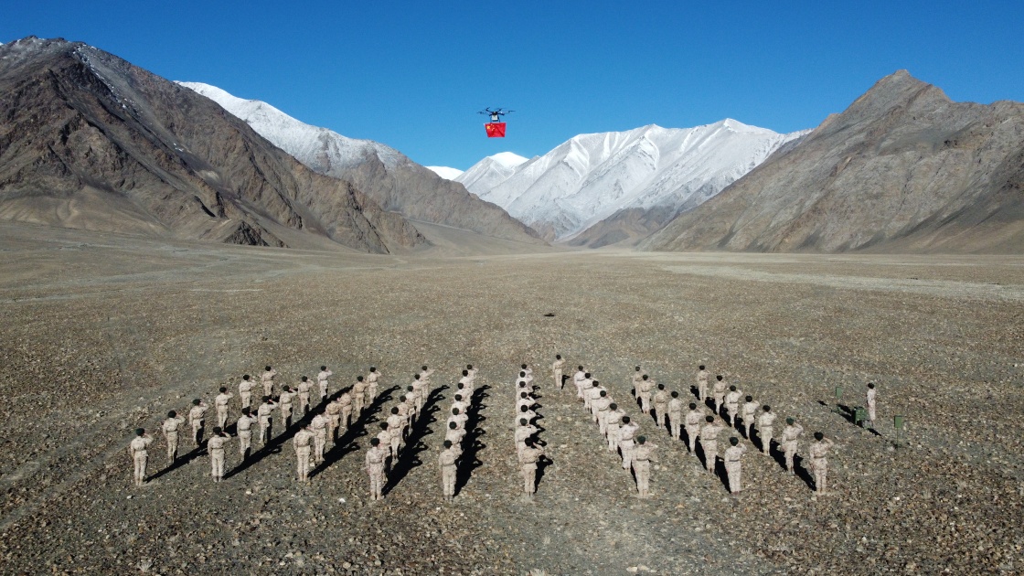 1月1日,正在藏北高原無人區(qū)駐訓(xùn)的新疆軍區(qū)某紅軍團(tuán)在雪山腳下組織官兵使用無人機(jī)舉行升國(guó)旗儀式。