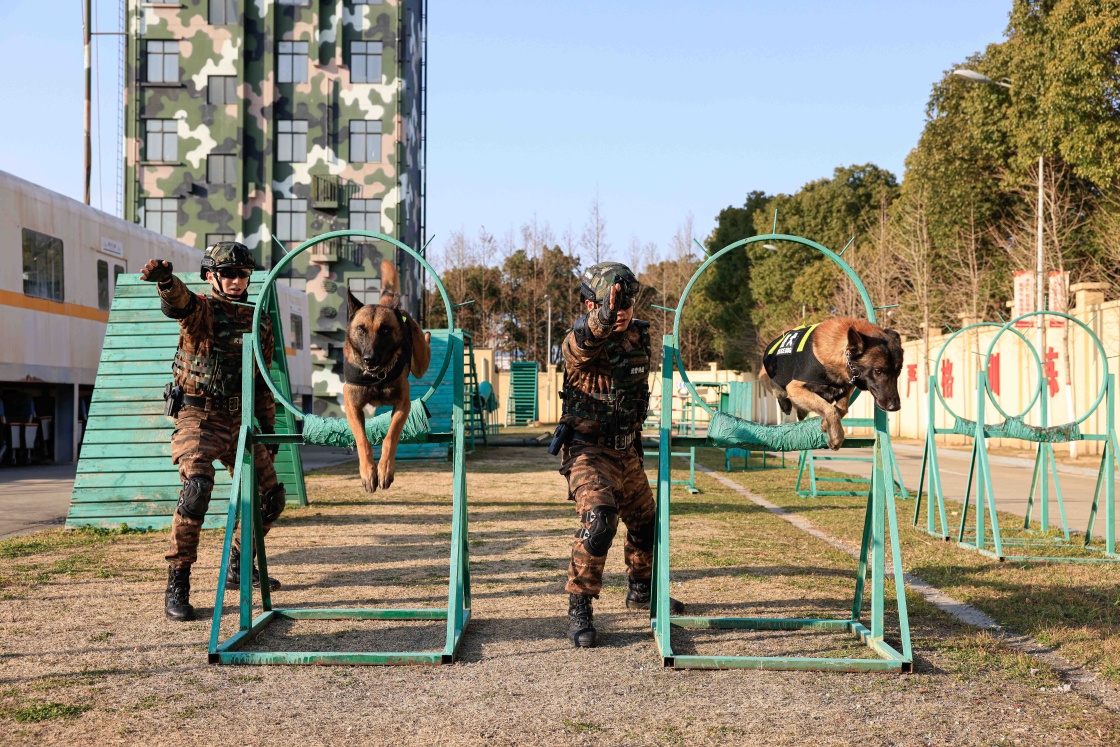 1月3日,武警上??傟?duì)機(jī)動(dòng)第一支隊(duì)警犬班官兵指揮警犬進(jìn)行通過(guò)障礙物訓(xùn)練。