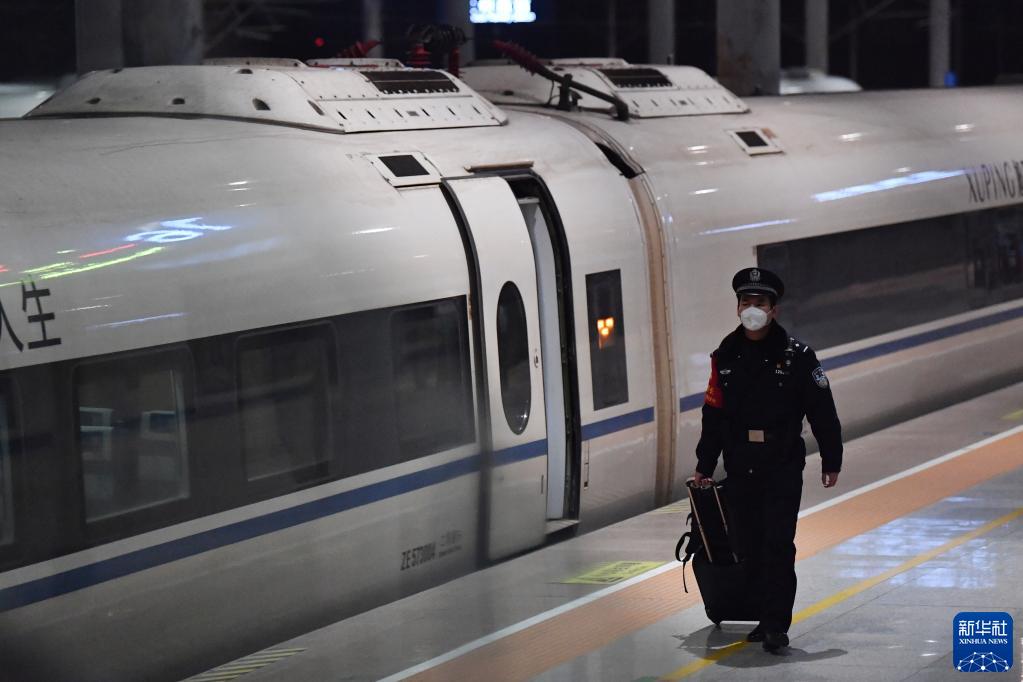 1月9日,白旭偉從G2686次動(dòng)車組列車旁走過(guò)。新華社記者 陳斌 攝