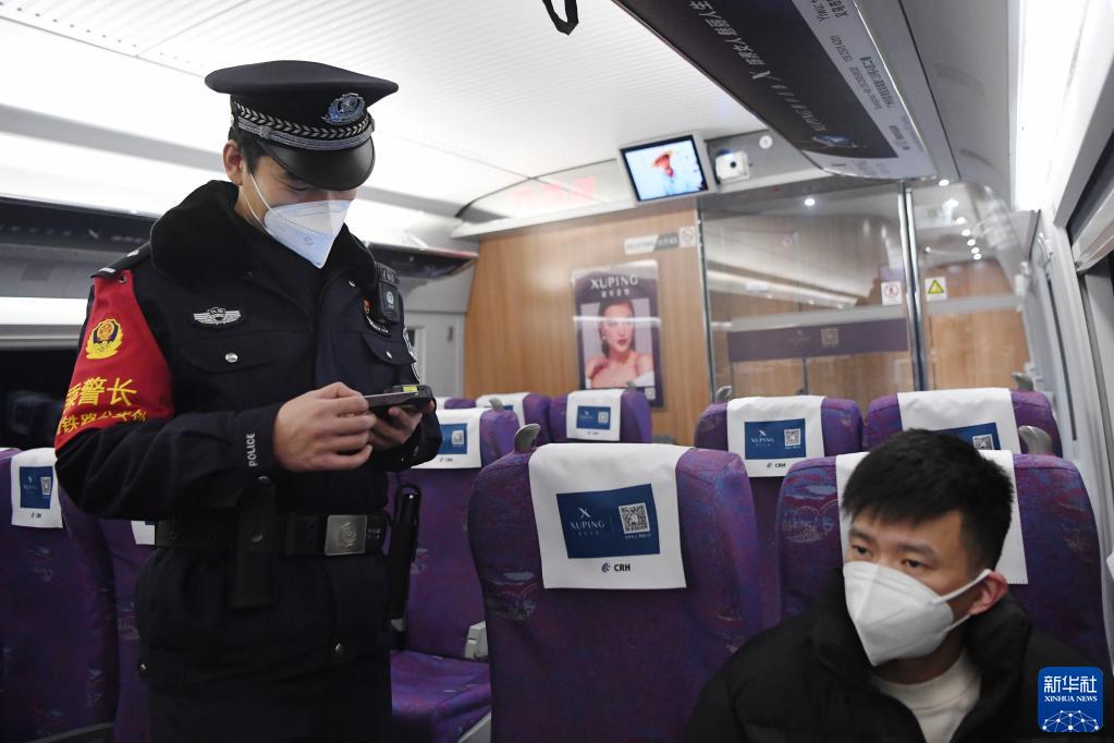 1月9日,白旭偉在G2686次動(dòng)車組列車上核驗(yàn)旅客身份信息。新華社記者 陳斌 攝