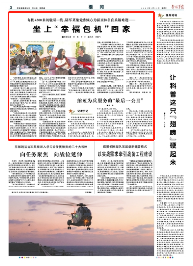 千里包機半日還。當日下午3時35分,包機穩(wěn)穩(wěn)降落在西南某機場。艙門打開,該旅某連二級上士、炮長張榮衛(wèi)興奮地走下飛機。這一次,他只用了5個多小時就到達目的地,耗時較以往大幅縮短。而他的戰(zhàn)友們,將繼續(xù)從這里中轉出發(fā),奔向各自的家。