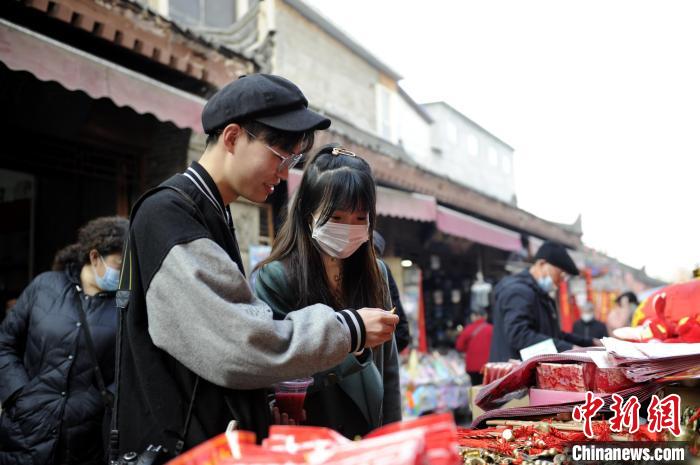 圖為前來都城隍廟攤位前挑選春聯(lián)的市民?!「咪?攝