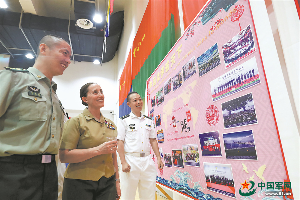 駐吉布提外軍人員參觀“中國踐行人類命運(yùn)共同體生動實(shí)踐”展板。本報特約通訊員 王宗洋攝