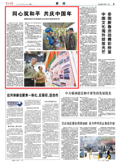 解放軍報北京1月27日電 堅守海外辭舊歲,共筑和平迎新春。連日來,我在海外執(zhí)行任務(wù)的維和部隊、護(hù)航編隊、駐吉布提保障基地官兵舉辦一系列豐富多彩的活動,共同慶祝中國農(nóng)歷兔年春節(jié),表達(dá)對祖國的祝福、對親人的思念、對和平的追求。
