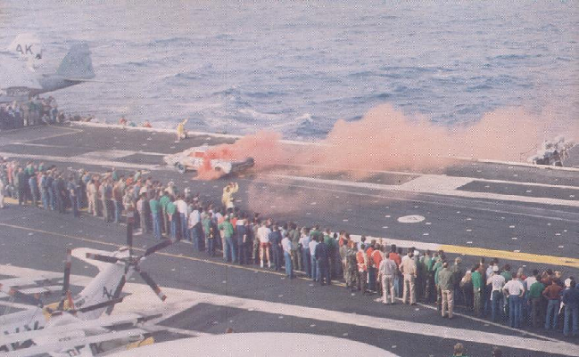 1985年珊瑚海號(hào)為了慶祝美國海軍成立210周年彈射了一輛1967年款?yuàn)W茲莫比爾442。
