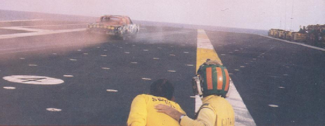 1985年珊瑚海號為了慶祝美國海軍成立210周年彈射了一輛1967年款?yuàn)W茲莫比爾442。