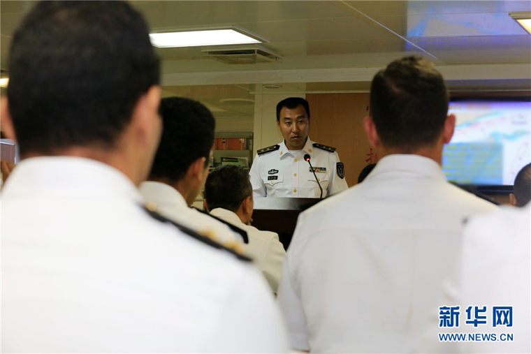 濟南艦副艦長張小忠向埃及海軍官兵代表介紹152艦艇編隊執(zhí)行護航任務(wù)情況。曾濤 攝