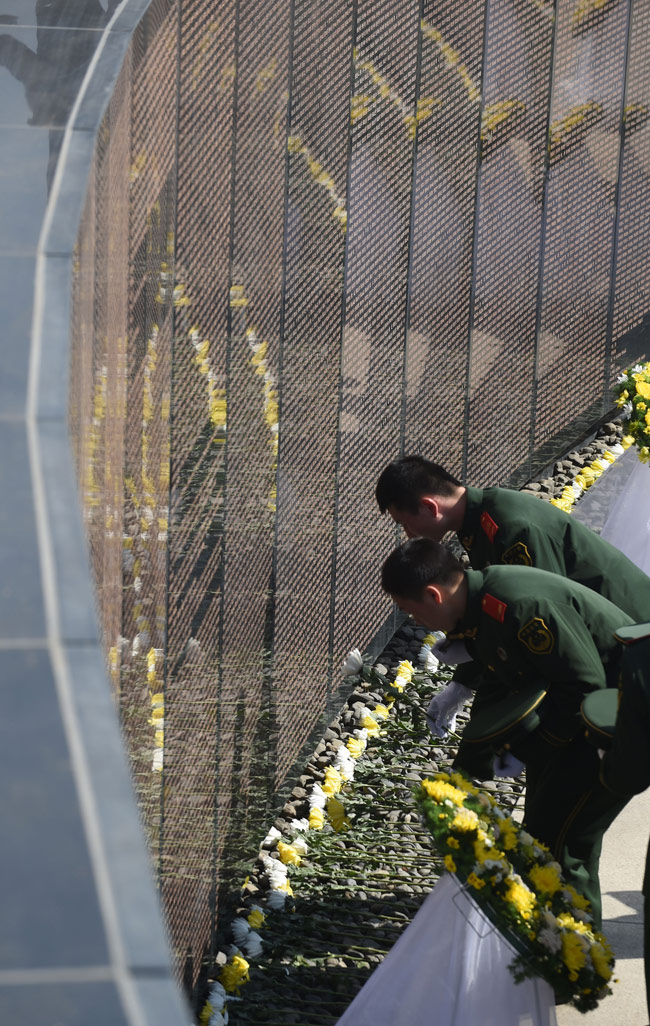 3月21日,解放軍戰(zhàn)士向烈士英名墻獻花。
