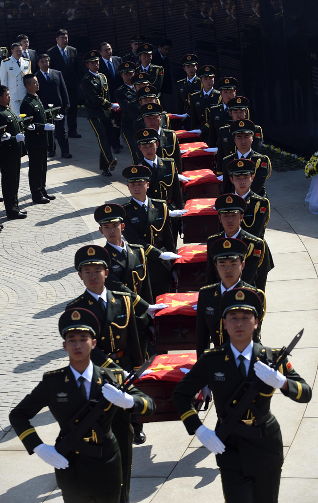 當(dāng)日,第二批在韓中國(guó)人民志愿軍烈士遺骸安葬儀式在遼寧沈陽(yáng)抗美援朝烈士陵園舉行。20日迎回的68位在韓志愿軍烈士的遺骸被安葬在沈陽(yáng)抗美援朝烈士陵園下沉式安葬地宮??姑涝沂考覍佟⒅驹杠娎媳吧鐣?huì)各界人士共同見(jiàn)證這一莊嚴(yán)時(shí)刻。新華社記者 楊青 攝