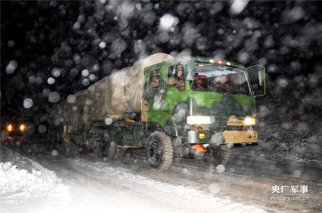 導(dǎo)彈戰(zhàn)車冒著大雪機(jī)動(dòng)。張洪亮 攝