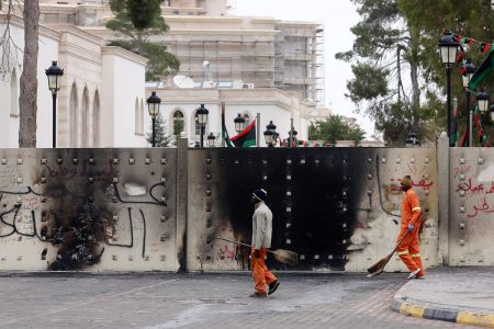 3月2日,在利比亞的黎波里,清潔工人從利比亞國民議會外走過。新華社照片,法新,2014年3月3日