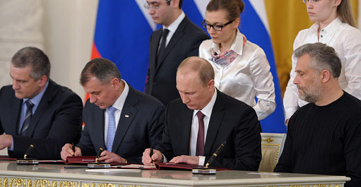 ??? 3月18日,俄羅斯總統(tǒng)普京在莫斯科克里姆林宮同克里米亞及塞瓦斯托波爾代表簽署條約,允許克里米亞和塞瓦斯托波爾以聯邦主體身份加入俄羅斯聯邦。新華社/俄新社