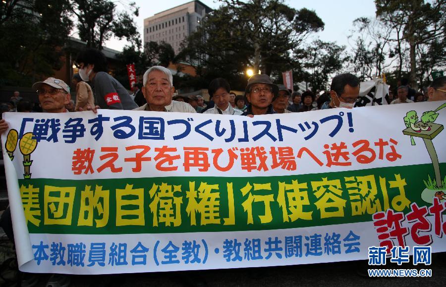 4月8日,在日本東京,民眾舉著希特勒造型的安倍漫畫示威,反對安倍政府修改憲法和解禁集體自衛(wèi)權(quán)的企圖。來自東京都及周邊縣市的大約5000名民眾、上百個市民團(tuán)體以及多名在野黨國會議員參加了當(dāng)晚的集會和示威游行。集會發(fā)起方在一份呼吁書中表示,安倍政府企圖以修改政府對憲法條文解釋的方式解禁集體自衛(wèi)權(quán),這是對憲法第9條反戰(zhàn)和平精神的徹底破壞。新華社記者馮武勇攝