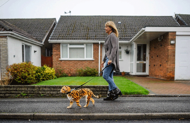 國際在線專稿:據(jù)英國《每日記事報(bào)》11月1日?qǐng)?bào)道,英國一女子日前用特殊染料將自己的寵物小狗全身涂滿老虎斑紋,儼然一只小老虎。在她領(lǐng)著“小老虎”外出散步時(shí),路人紛紛聚攏過來,為其拍照。