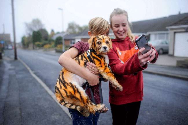 英國女子杰基·西蒙茲用特殊染料將自己的寵物小狗全身涂滿老虎斑紋。(網(wǎng)頁截圖)