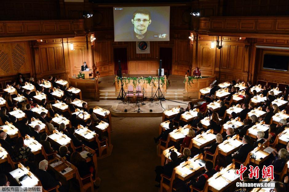 當(dāng)?shù)貢r(shí)間12月1日,瑞典斯德哥爾摩,前美國安全員斯諾登通過網(wǎng)絡(luò)領(lǐng)取了有“諾貝爾替代獎(jiǎng)”之稱的2014年瑞典“正確生活方式獎(jiǎng)”。此獎(jiǎng)項(xiàng)為了表彰他“表現(xiàn)出勇氣和智慧,揭露了空前的侵犯基本民主程序和憲法人權(quán)的大規(guī)模國家監(jiān)控計(jì)劃”。