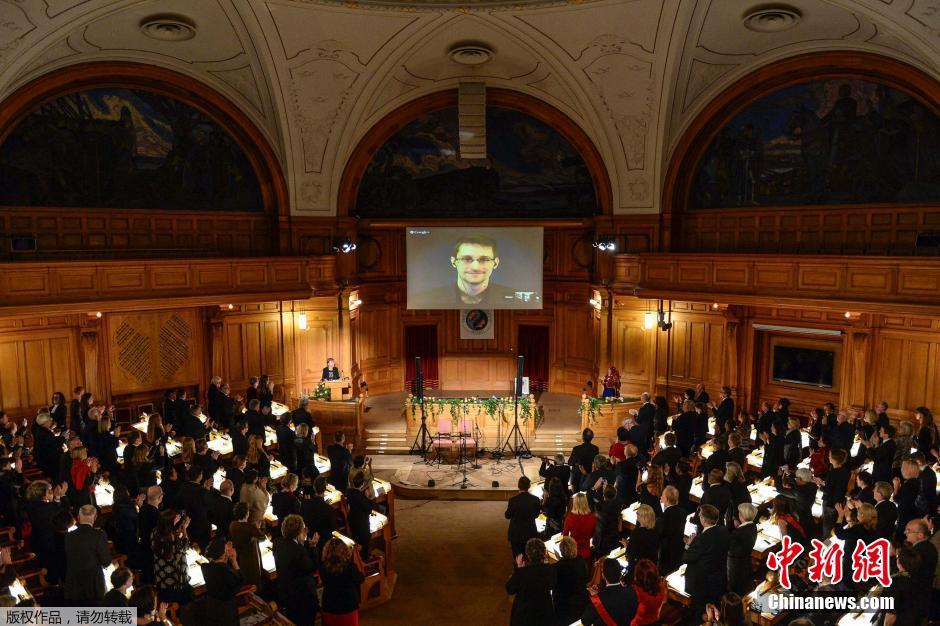 當(dāng)?shù)貢r(shí)間12月1日,瑞典斯德哥爾摩,前美國(guó)安全員斯諾登通過(guò)網(wǎng)絡(luò)領(lǐng)取了有“諾貝爾替代獎(jiǎng)”之稱的2014年瑞典“正確生活方式獎(jiǎng)”。此獎(jiǎng)項(xiàng)為了表彰他“表現(xiàn)出勇氣和智慧,揭露了空前的侵犯基本民主程序和憲法人權(quán)的大規(guī)模國(guó)家監(jiān)控計(jì)劃”。