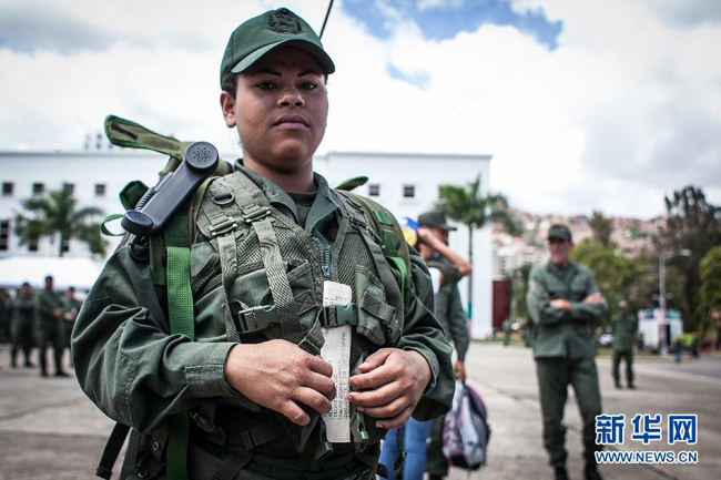 3月14日,在委內(nèi)瑞拉首都加拉加斯,一名女兵參加軍事演習(xí)。新華社發(fā)(鮑里斯·貝爾加拉攝)