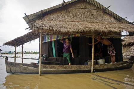 8月10日,在緬甸伊洛瓦底省一戶民居中,村民從被洪水包圍的房間內(nèi)轉(zhuǎn)移到一條船中。