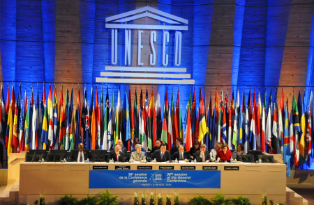 11月3日,在法國巴黎,大會開幕式由第37屆大會主席、中國教育部副部長郝平(前排右四)主持聯(lián)合國教科文組織第38屆大會。聯(lián)合國教科文組織第38屆大會3日在巴黎開幕。世界各地會員代表將在16天的會期里討論下一個雙年度工作計劃,并將圍繞聯(lián)合國2030年可持續(xù)發(fā)展議程提出實施路線圖?!⌒氯A社記者 尚栩 攝