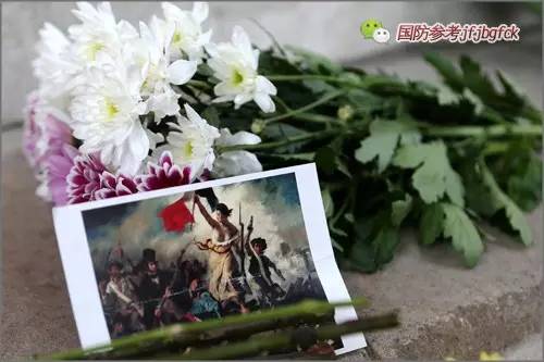 2015年11月14日,人們?cè)谖挥谟?guó)倫敦的法國(guó)大使館門前擺放鮮花和法國(guó)名畫《自由引導(dǎo)人民》的圖片,悼念巴黎恐怖襲擊遇難者。