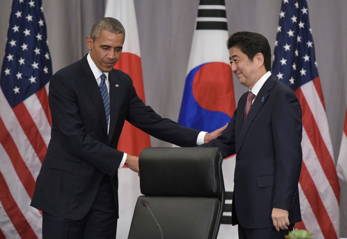 3月31日,在美國華盛頓,美國總統(tǒng)奧巴馬(左)和日本首相安倍晉三在美日韓三方會談后握手。