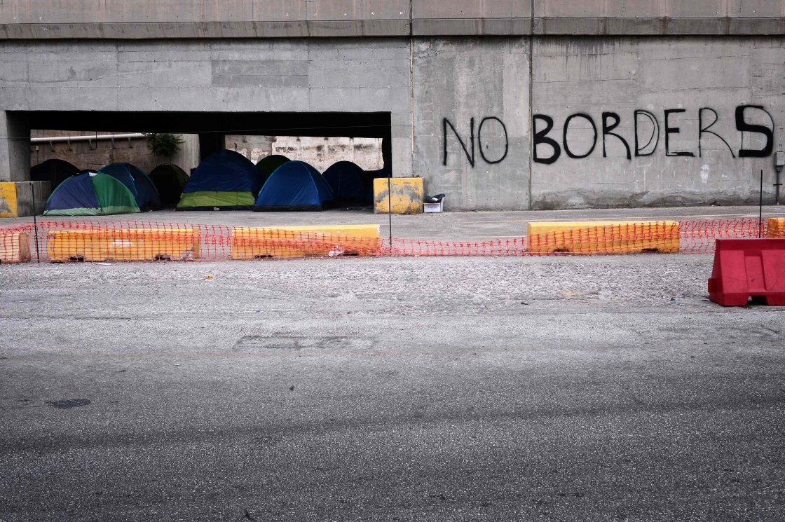 這是5月18日在希臘比雷埃夫斯港一處臨時(shí)難民營(yíng)拍攝的搭在橋下的帳篷。