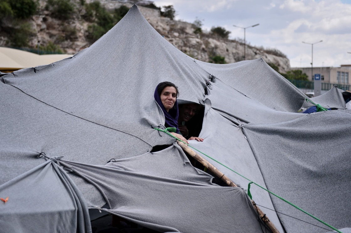 5月18日,在希臘比雷埃夫斯港的一處臨時難民營,一名敘利亞婦女從一座由毯子搭建成的帳篷內(nèi)向外張望。
