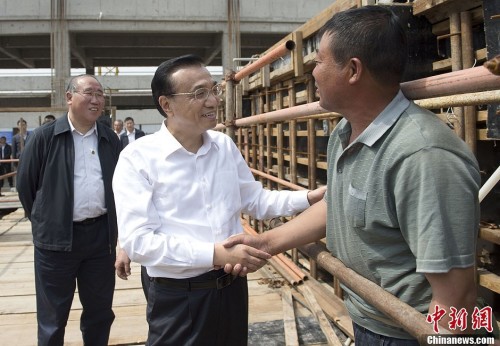 5月22日,在赤峰污水處理項(xiàng)目工地,李克強(qiáng)走上腳手架與農(nóng)民工交談。