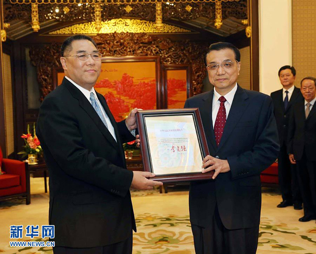 9月22日,國務院總理李克強在北京中南海紫光閣會見來京接受任命的澳門特別行政區(qū)行政長官崔世安,并頒發(fā)任命崔世安為中華人民共和國澳門特別行政區(qū)第四任行政長官的國務院令。新華社記者 劉衛(wèi)兵 攝