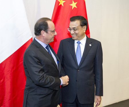 10月16日,中國國務(wù)院總理李克強在米蘭會見法國總統(tǒng)奧朗德。新華社記者 王曄 攝