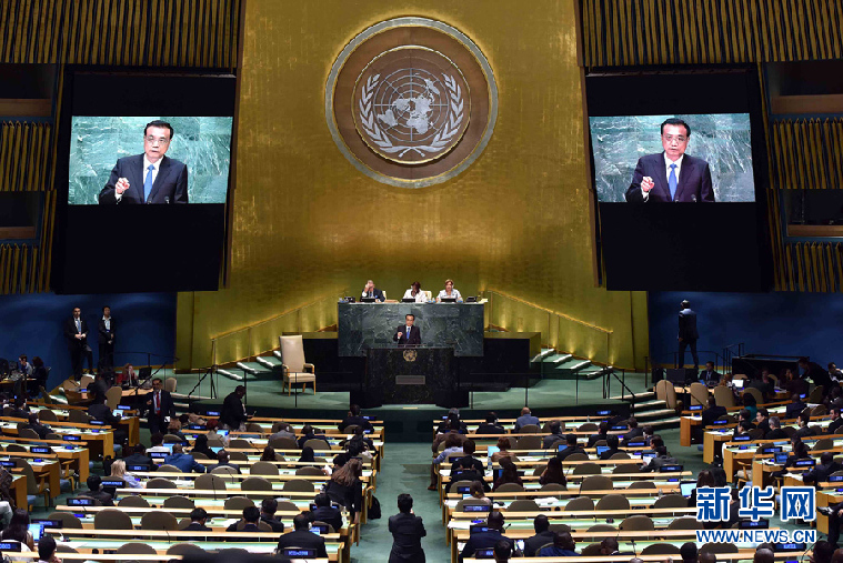 9月21日,國務(wù)院總理李克強在紐約聯(lián)合國總部出席第71屆聯(lián)合國大會以“可持續(xù)發(fā)展目標:共同努力改造我們的世界”為主題的一般性辯論并發(fā)表題為《攜手建設(shè)和平穩(wěn)定可持續(xù)發(fā)展的世界》的重要講話。新華社記者 李濤 攝
