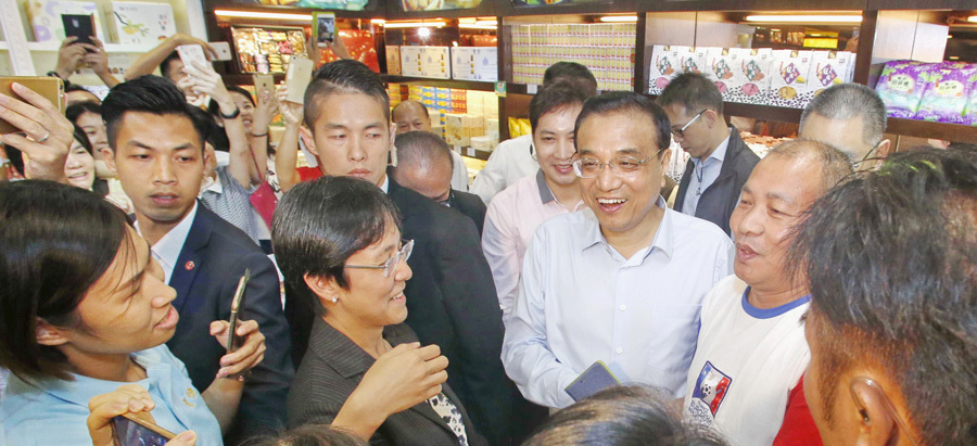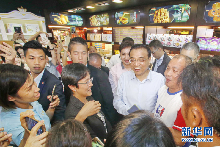 10月11日下午,在出席中國-葡語國家經(jīng)貿(mào)合作論壇第五屆部長級會議開幕式后,國務(wù)院總理李克強在澳門特別行政區(qū)行政長官崔世安陪同下,在澳門視察。這是李克強在澳門官也街一家售賣當(dāng)?shù)靥禺a(chǎn)的商店同店主和游客親切交談。新華社記者 鞠鵬 攝