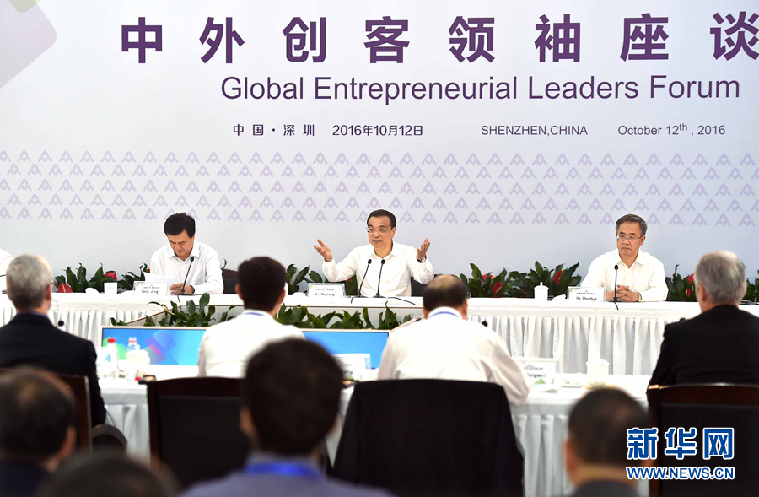 10月12日至13日,中共中央政治局常委、國務院總理李克強在廣東深圳、東莞考察,并出席2016年全國大眾創(chuàng)業(yè)萬眾創(chuàng)新活動周。這是10月12日,李克強在深圳主持召開中外創(chuàng)客領(lǐng)袖座談會并講話。 新華社記者 李濤攝