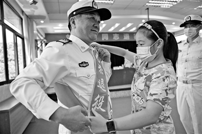 看著眼前一張張熟悉的面龐,劉達(dá)勇淚流滿面。葉子為父親認(rèn)真整理“光榮退役”綬帶。從父親起伏的胸膛,女兒感受到了他內(nèi)心的激動(dòng)。