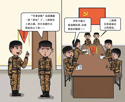 二班班長周鑫不以為然:“新兵剛下連,各班成績好壞,一定程度上取決于分到本班新兵體能素質(zhì)的高低和接受能力的強(qiáng)弱,班里有一個體能尖子,就能把整個班訓(xùn)練成績提高不少,現(xiàn)行的評選細(xì)則不夠科學(xué)……”