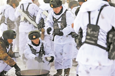 圖①:新疆軍區(qū)某合成師官兵在高原冬季演練間隙,進行熱食補充。