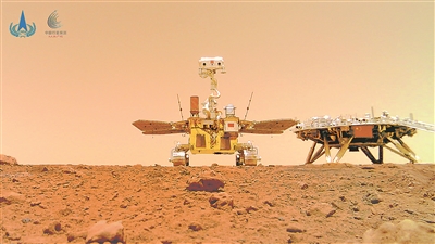 上圖:祝融號火星車拍攝的“著巡合影”圖。新華社發(fā)(國家航天局供圖)