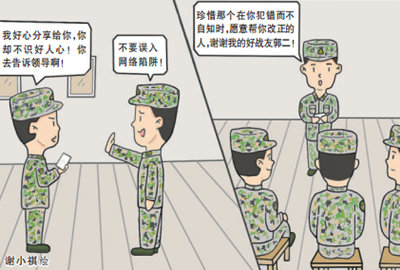 羞愧難當?shù)膹埍贾鲃酉蛭业狼?,還向指導員報告連隊目前有多名戰(zhàn)友加裝了這個程序,正準備躍躍欲試。聞言,指導員耐心地勸慰了張奔一番,讓他回去反思,并安排他在晚點名時現(xiàn)身說法,給戰(zhàn)友們提供警示。