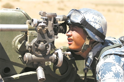 7月8日,空降兵某旅將部隊(duì)拉到茫茫戈壁組織炮兵實(shí)彈射擊演練,錘煉部隊(duì)火力打擊能力。圖為一名戰(zhàn)士正在觀測(cè)瞄準(zhǔn)。何 勇攝