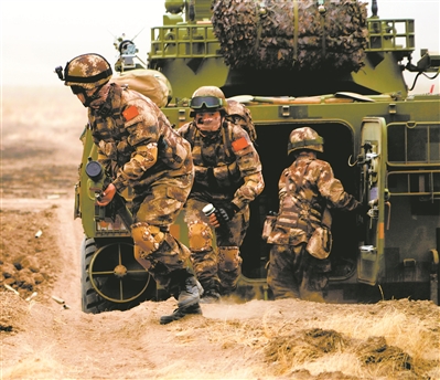 實(shí)兵行動(dòng)開始后,只見空中一架架戰(zhàn)機(jī)發(fā)射密集火力,對(duì)“恐怖武裝”實(shí)施猛烈打擊。緊接著,炮兵分隊(duì)對(duì)“敵”縱深陣地實(shí)施火力覆蓋。重火突擊之后,隱蔽在草原深處的我軍輪式裝甲分隊(duì),從半地下掩體一躍而出,向“敵”陣地突進(jìn)。