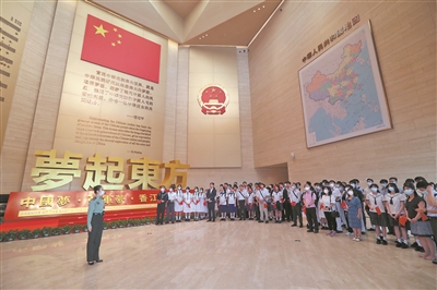 本報香港10月1日電 孟垂云報道:10月1日上午,來自香港漢華中學、培僑中學、香島中學等學校的百余名師生以及市民代表,走進新建成的駐香港部隊展覽中心,參加升國旗儀式,參觀“夢起東方”主題展覽,開展愛國主義和國防教育,慶祝中華人民共和國成立72周年。