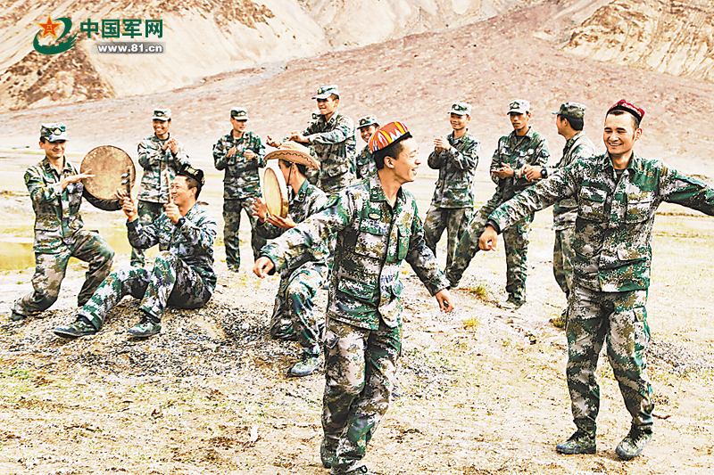 駐訓在海拔4000多米喀喇昆侖山上的新疆軍區(qū)某團,在青年官兵中廣泛開展學說民族語言、學唱民族歌曲、學跳民族舞蹈、廣交民族朋友的活動,并搜集少數民族的風俗習慣、日常用語、生活諺語整理成口袋書,下發(fā)到每名官兵手中,促進了民族團結,密切了軍民關系。圖為官兵們在野外跳起舞蹈“麥西來甫”。張景盛攝影報道?