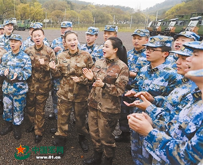 軍委政治工作部歌舞團(tuán)演員們與東海艦隊(duì)通信總站官兵一起高歌《強(qiáng)軍戰(zhàn)歌》。代宗鋒攝