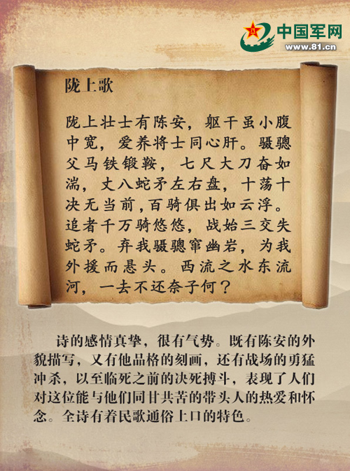 歷代古詩有很多以民歌為本體的軍旅詩,歌頌了將士們勇敢戰(zhàn)斗的精神,以及充滿著勝利之后的壯志豪情。同為華夏子孫,請通過這九張圖感受他們威武不屈的戰(zhàn)斗精神!