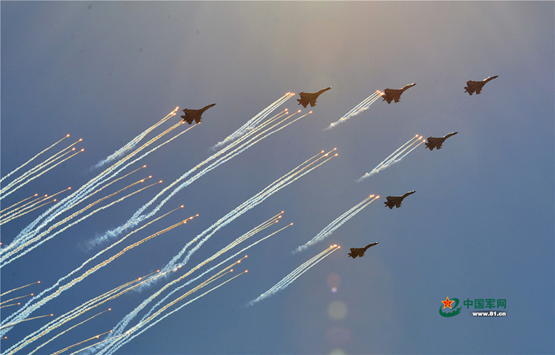 慶祝中國人民解放軍建軍90周年閱兵在位于內(nèi)蒙古的朱日和訓(xùn)練基地舉行。這是殲擊機(jī)梯隊(duì)。中國軍網(wǎng)記者岱天榮 攝